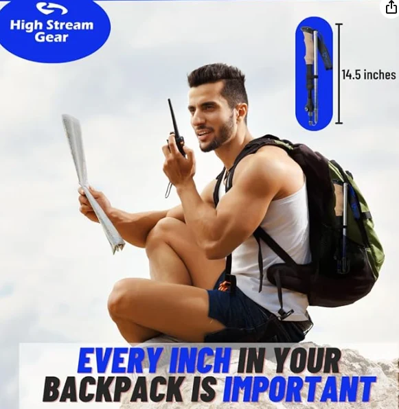 Los postes de senderismo para los excursionistas se derrumban a 37 cm (14.5 pulgadas) y pesan solo 10 onzas, cada uno de los cuales, dejándole el lugar para sus elementos esenciales y su equipo personal.