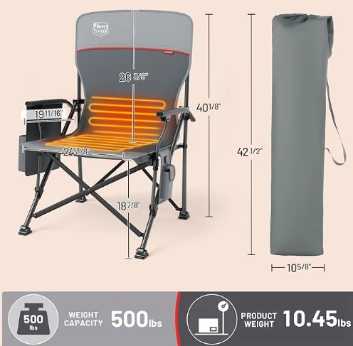 Silla plegable con calefacción personalizada, zonas de calefacción duales para la parte posterior y el asiento calentando hasta 131 ° F en solo 10 segundos. Tres configuraciones de calor (104 ° F, 122 ° F, 131 ° F) proporcionan calor para cualquier ocasión al aire libre (batería no incluida).