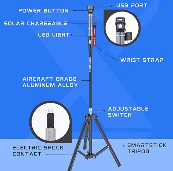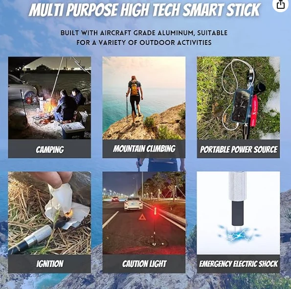 Pole de trekking de luz LED. Polo de trekking multipropósito de calidad de Premio para senderismo, palo para caminar de supervivencia y palanca de defensa propia plegable para cualquier actividad peligrosa al aire libre.