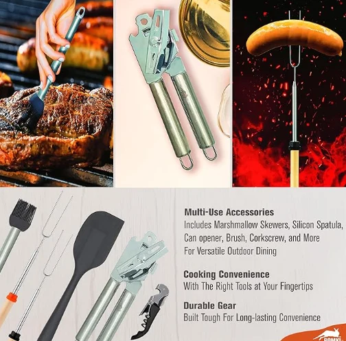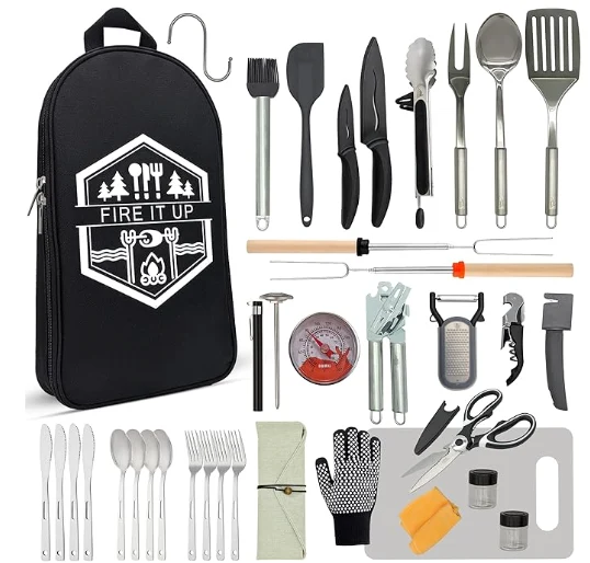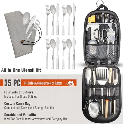 Bolsa de almacenamiento de utensilios de cocina para acampar al aire libre Este juego de utensilios de cocina para campamento de 35 PC es una solución completa para sus necesidades de cocción al aire libre. Incluye un juego de cocina para acampar y un juego de cocina para acampar, todo bien lleno en una bolsa personalizada con compartimentos adicionales y dos bolsillos traseros. El set está diseñado para atender todos sus elementos esenciales de cocción para acampar, por lo que es una adición indispensable a su equipo de campamento