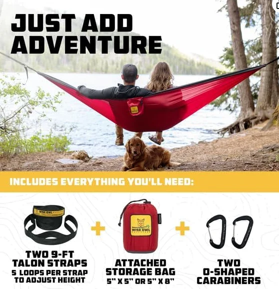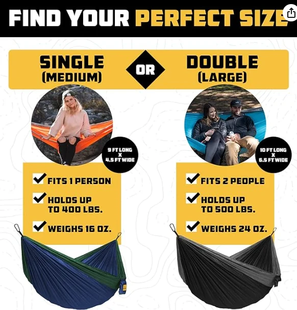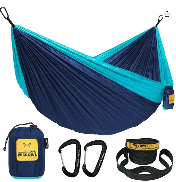 Hamaca de campamento 3 en 1 portátil. El búho individual asienta cómodamente a una persona y puede contener hasta 400 libras. El búho doble puede contener hasta 500 libras, y es perfecto para dos.zhejiang Jiayu Outdoor Products Co., Ltd. Cuando no esté en uso, enrolle la hamaca acampando de los Overos de Owl en la bolsa de almacenamiento adjunta. Cuando se desenrolla, la bolsa funciona como un bolsillo para su teléfono, bebida u otros artículos. No es más grande que una berenjena cuando compacta, esta hamaca es perfecta para llevar a las aventuras al aire libre.