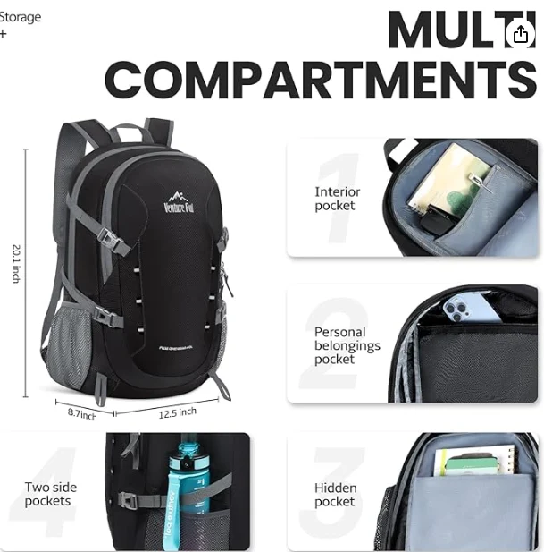 Mochila plegable de senderismo impermeable, se agrega un bolsillo húmedo impermeable al compartimento principal, una cremallera en la parte posterior de esta mochila que condujo al bolsillo húmedo interno, para separar mejor ropa sudorosa, toallas u otras cosas personales después de nadar o hacer ejercicio