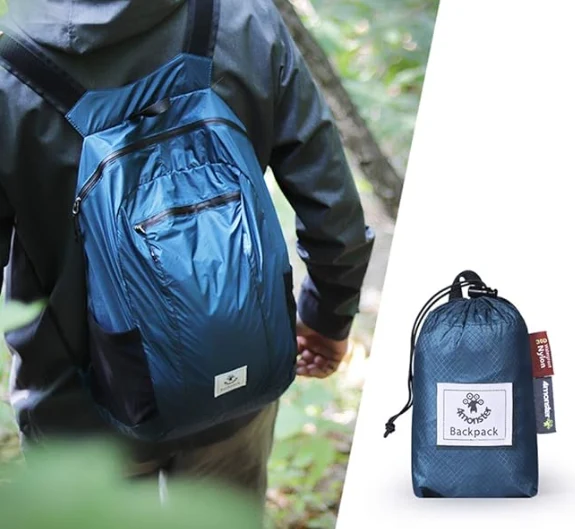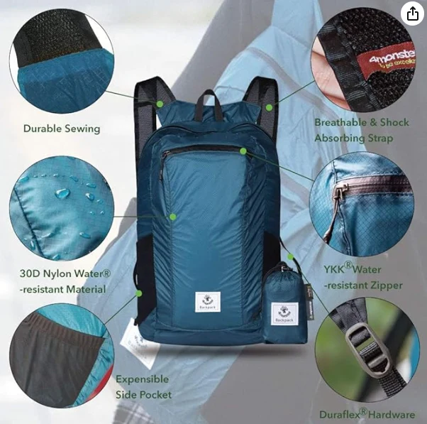 Mochila de senderismo ligero impermeable, esta mochila liviana de senderismo está hecha de material resistente al agua y cremallera. Evite efectivamente que el agua de lluvia moja el teléfono o en efectivo y otros artículos en la mochila.